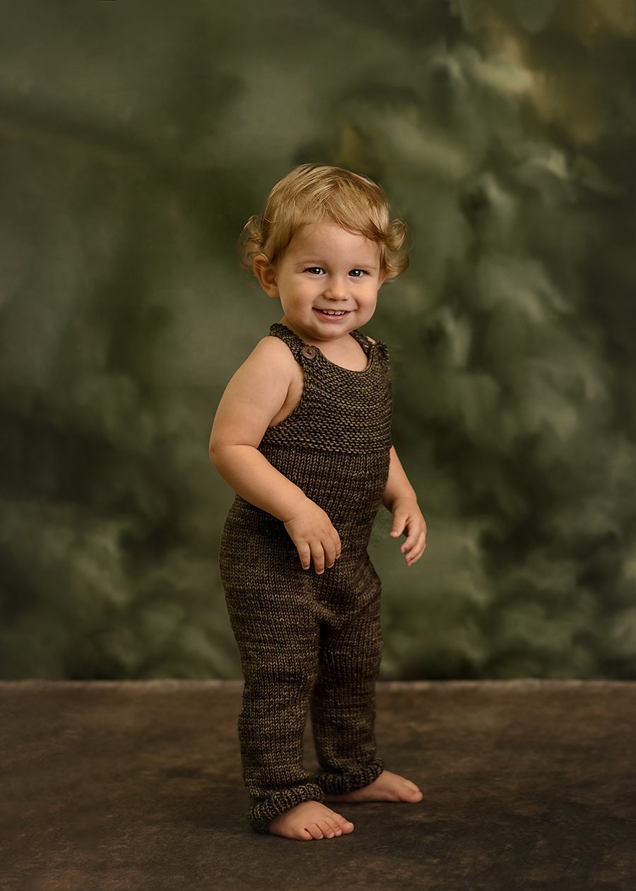 curly haired boy with hand knit overalls